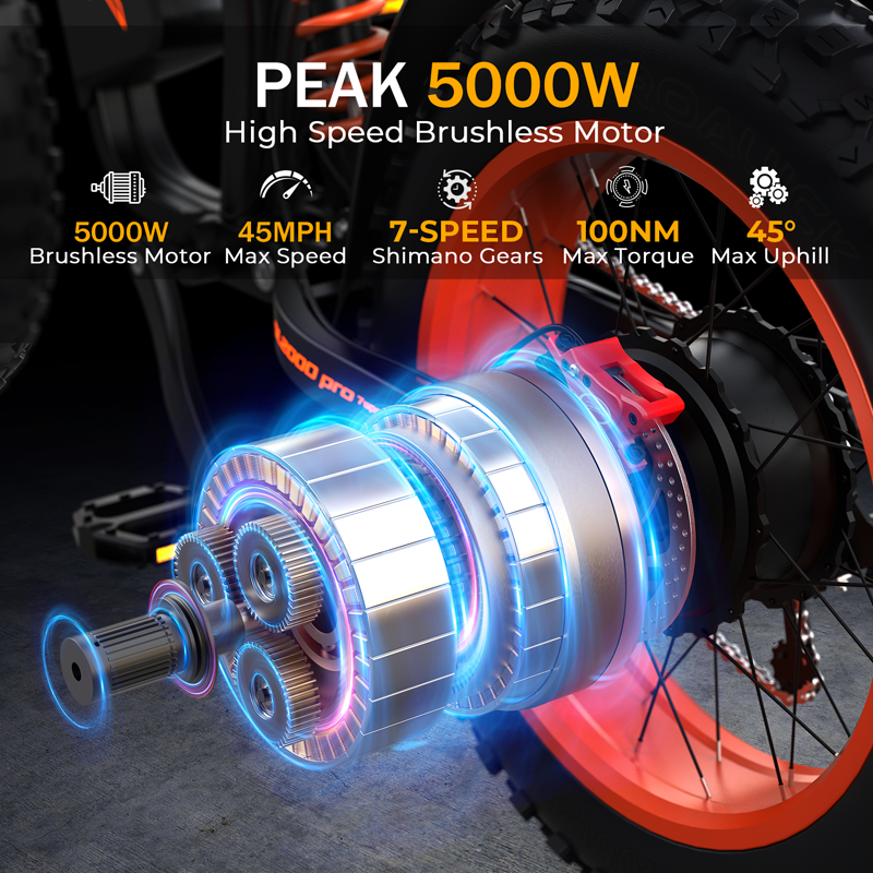 KAOLORY eBike is a high-performance brushless motor with a peak output of up to 5000W, delivering strong torque, confident hill-climbing ability, and smooth acceleration whether you’re cruising city streets or tackling rugged trails. This level of motor power offers a thrilling yet controlled riding experience that elevates everyday commutes and off-road adventures alike.