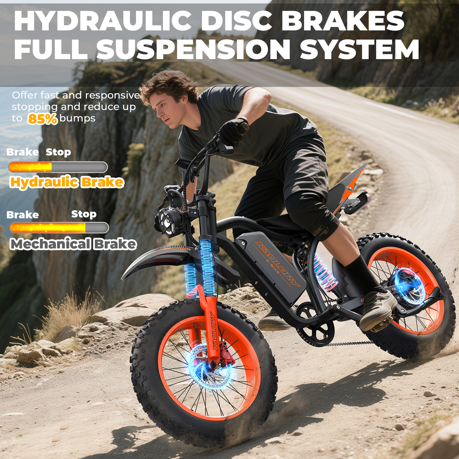 KAOLORY eBike is designed with rider comfort in mind. The KAOLORY eBike features a full suspension system that absorbs bumps and reduces fatigue on long rides. For confident stopping power in varied conditions, dual hydraulic disc brakes deliver strong, reliable braking performance — a key safety feature on higher-powered electric bikes.